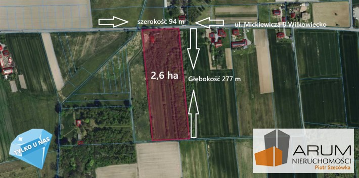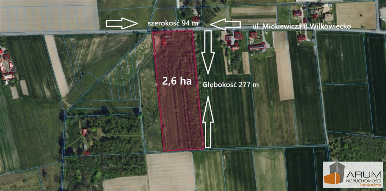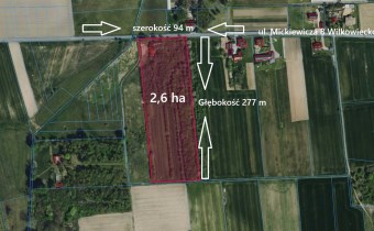 Prezentujemy do sprzedania bardzo atrakcyjną działkę o powierzchni 2,6 ha m2 położoną w miejscowości Wilkowiecko przy ulicy Mickiewicza 8