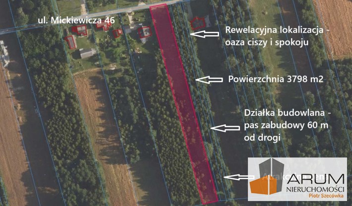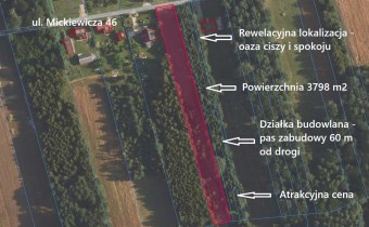 Prezentujemy do sprzedania urokliwą działkę o powierzchni 3798 m2 położoną w lesie w miejscowości Wilkowiecko przy ulicy Mickiewicza 46